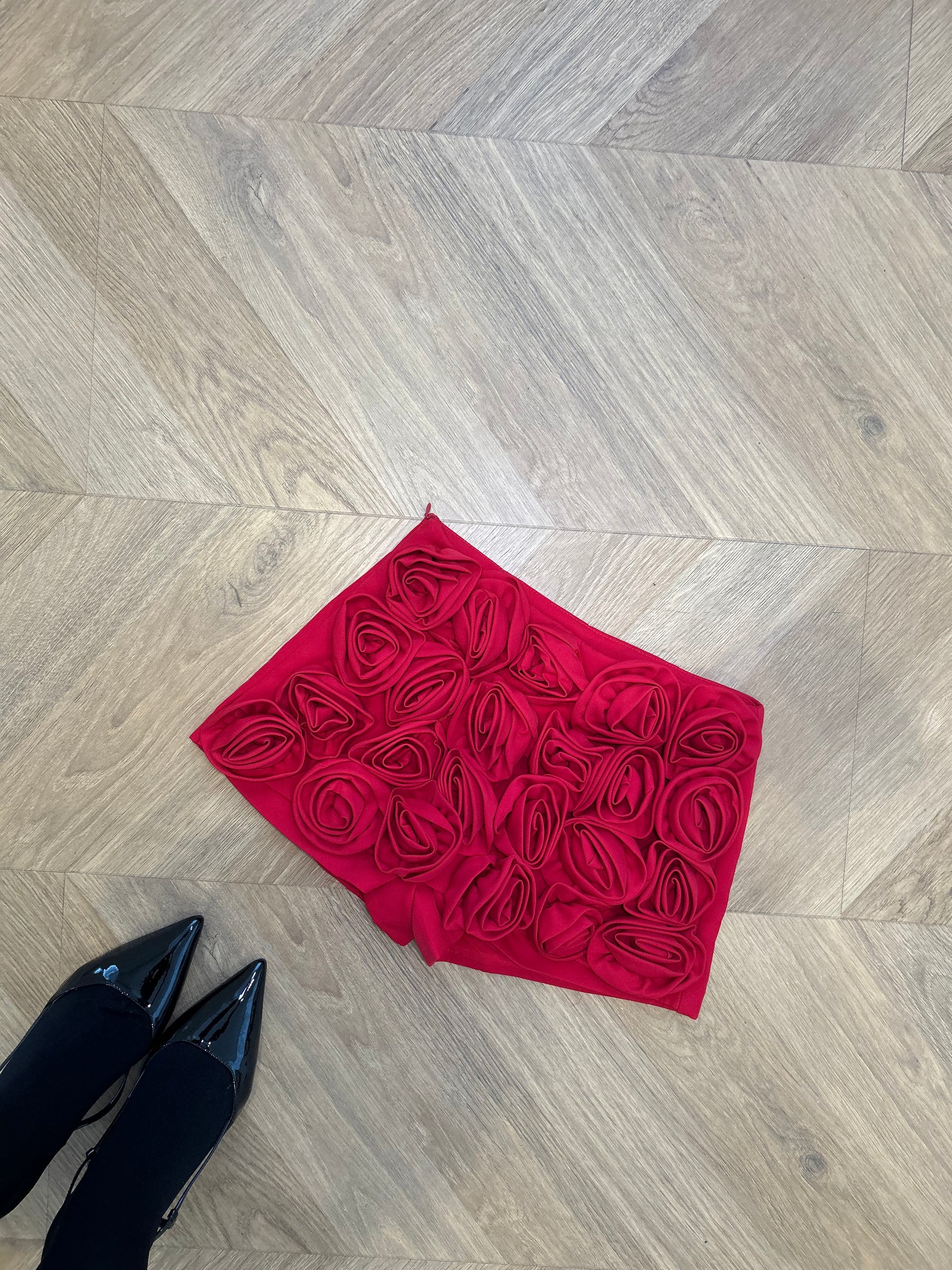 The cutest mini shorts with floral rose detailing on the front.