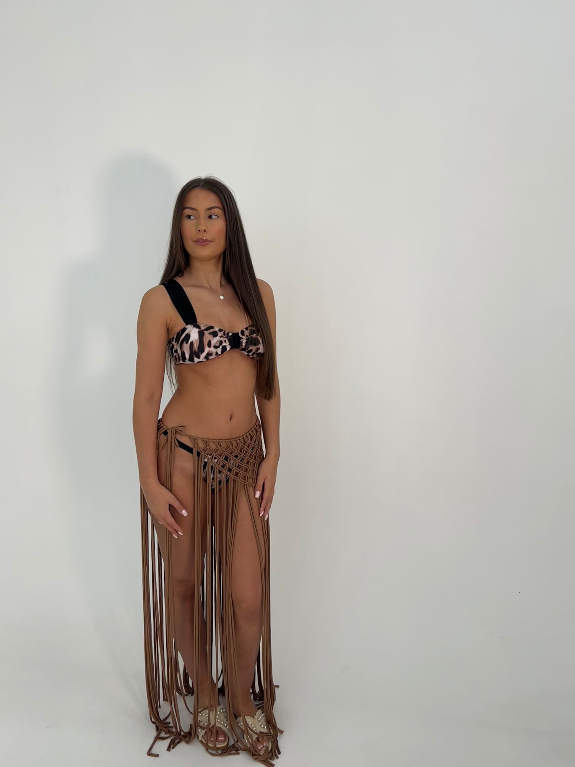 Crotchet maxi skirt with tassel detailing in a mocha brown colour. Ready to wear for your next beach day.