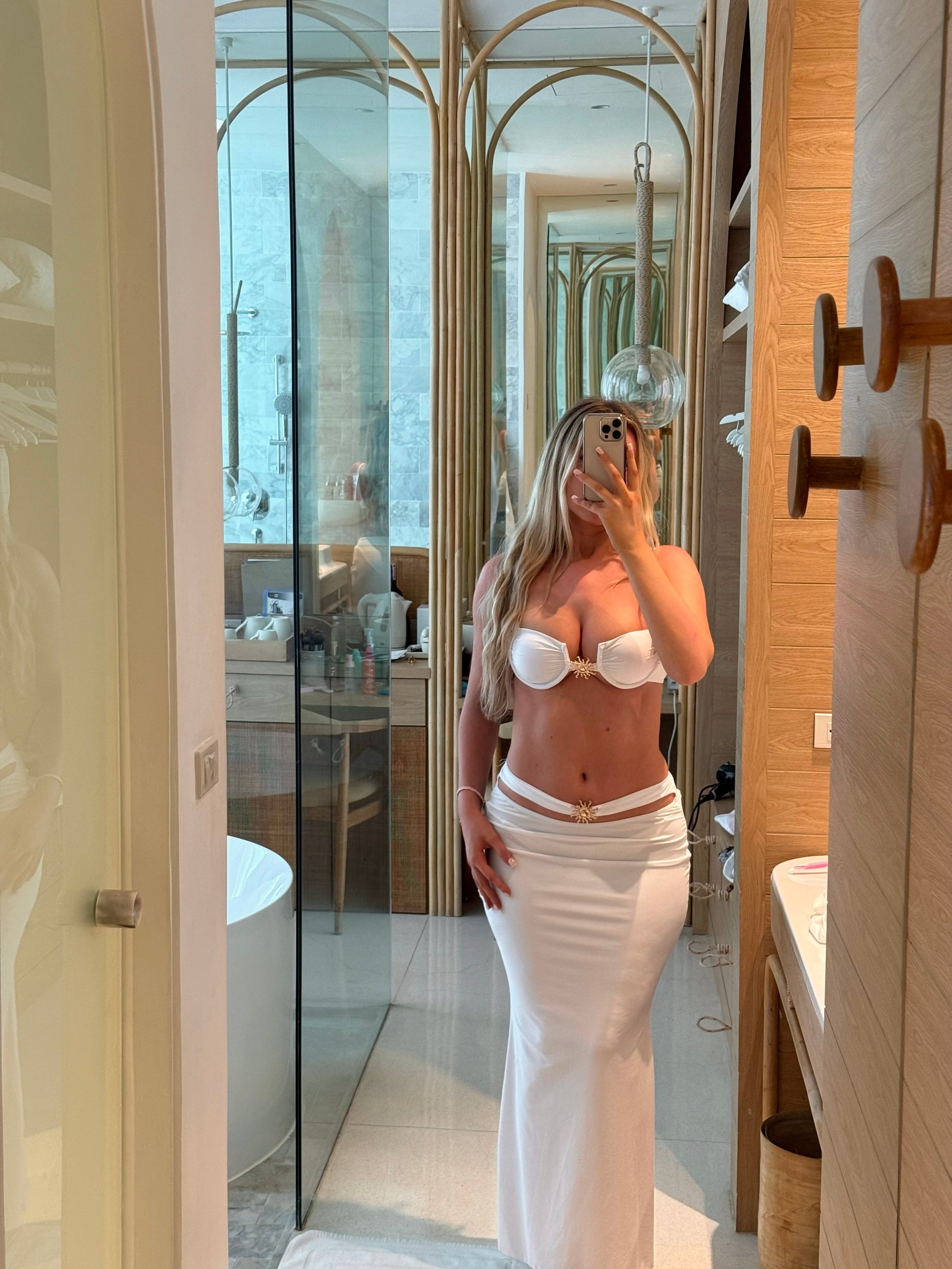 Three piece bikini set featuring gold 'sun-ray' detailing. Perfect for a day at the beach club or an evening look!